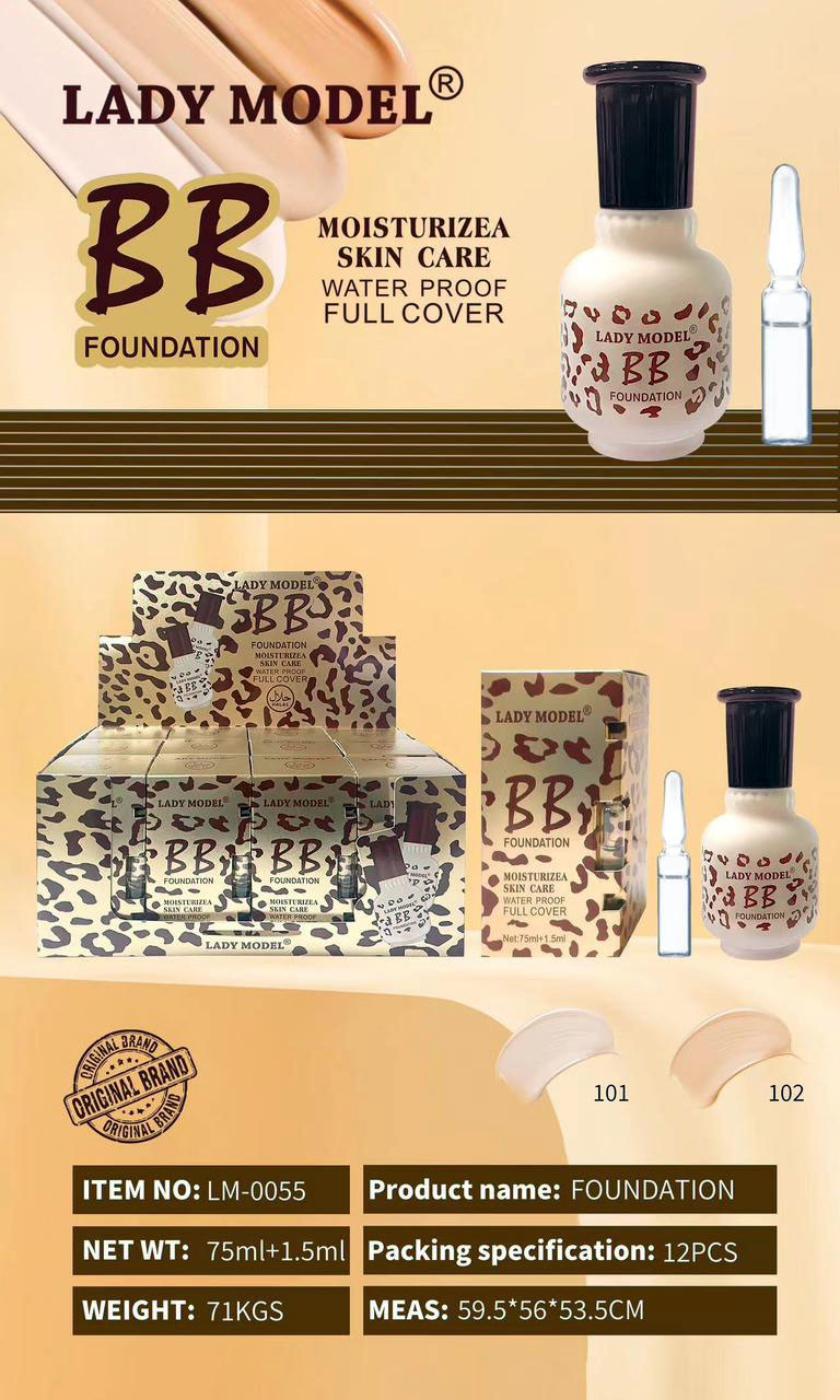 ليدي موديل BB Foundation: كريم أساس مرطب، مقاوم للماء، يوفر تغطية كاملة وبشرة ناعمة وموحدة اللون.