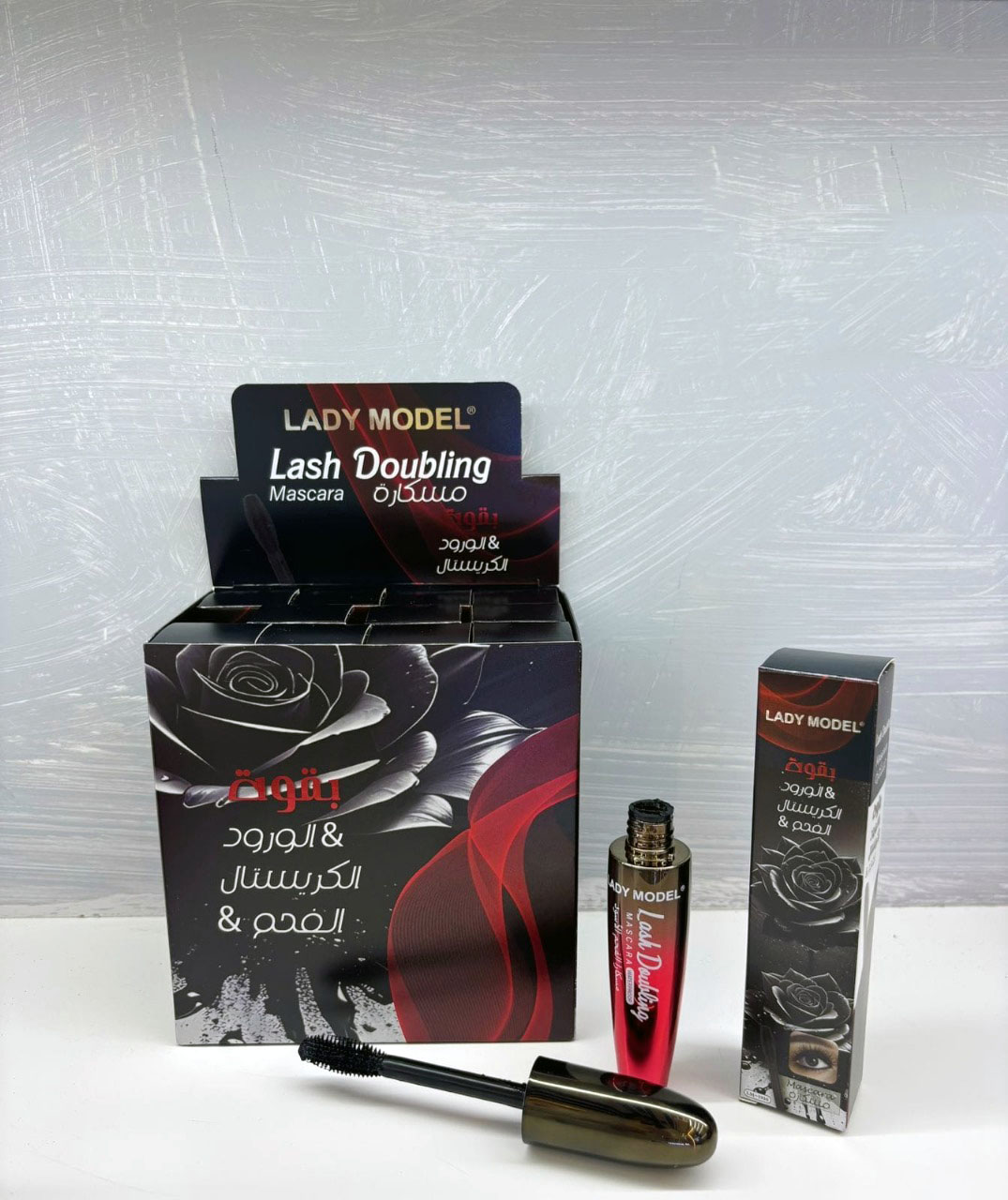 ماسكارا ليدي موديل Lash Doubling: تركيبة مكثفة تضاعف حجم الرموش وتمنحها لونًا أسودًا فاحمًا لمظهر عيون جريئة.